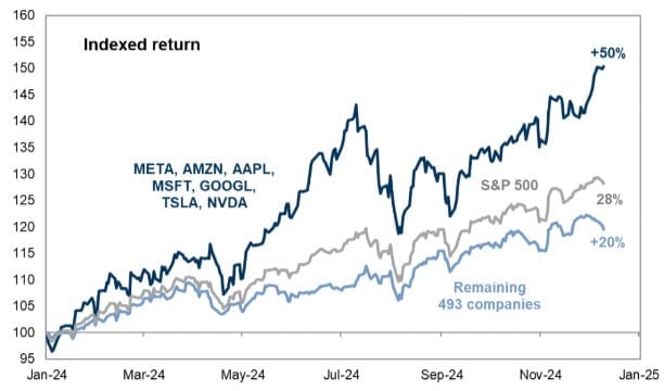 While the S&P 500 was up +28% during 2024, the Mag 7 was up +50% — with the “Other 493” companies up only +20%.
