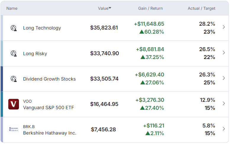 Broken out by asset class, I invested $31,427 into stocks and ETFs — returning 37.1%. This brings our single stock and ETF portfolio’s value up to $126,800 as shown below.
