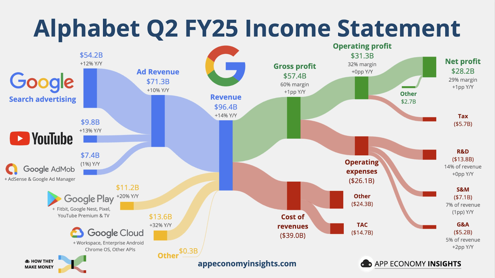 In Q2, Alphabet posted $96.4 billion in revenue (+14% YoY) and $2.31 in EPS (+22%), both above expectations. Strength in Search, YouTube, and Google Cloud drove results, with Cloud revenue up 32% to $13.6 billion and operating margin steady at 32.4%, despite higher depreciation tied to AI buildouts. The company also expanded its capital return program while continuing to invest in its AI ecosystem through Gemini, YouTube AI tools, and the Android ecosystem.