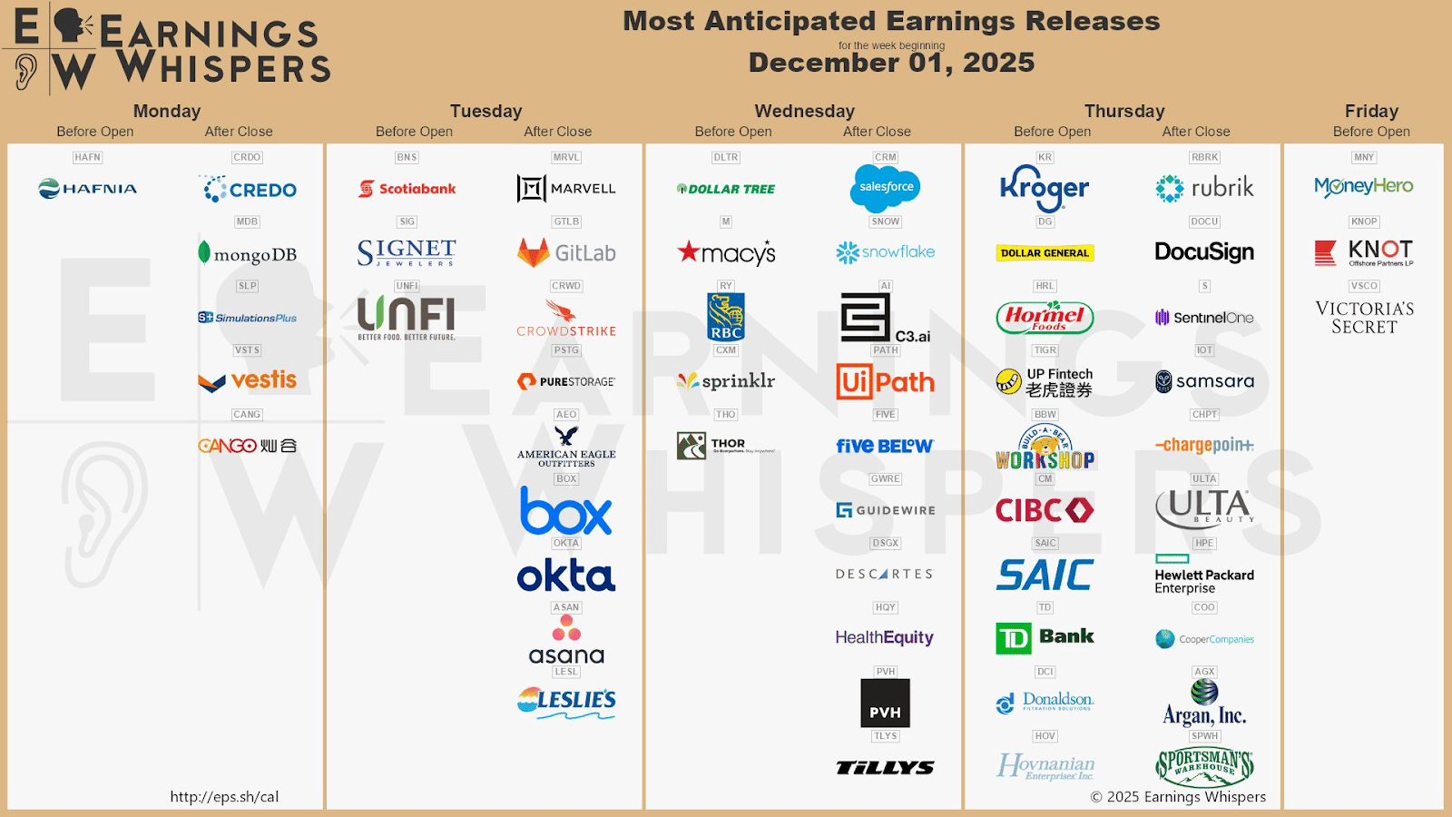 Tuesday (12/2): American Eagle Outfitters, Asana, Box, CrowdStrike, GitLab, Leslie’s, Marvell, Okta, Pure Storage, Signet Jewelers, Sprinklr