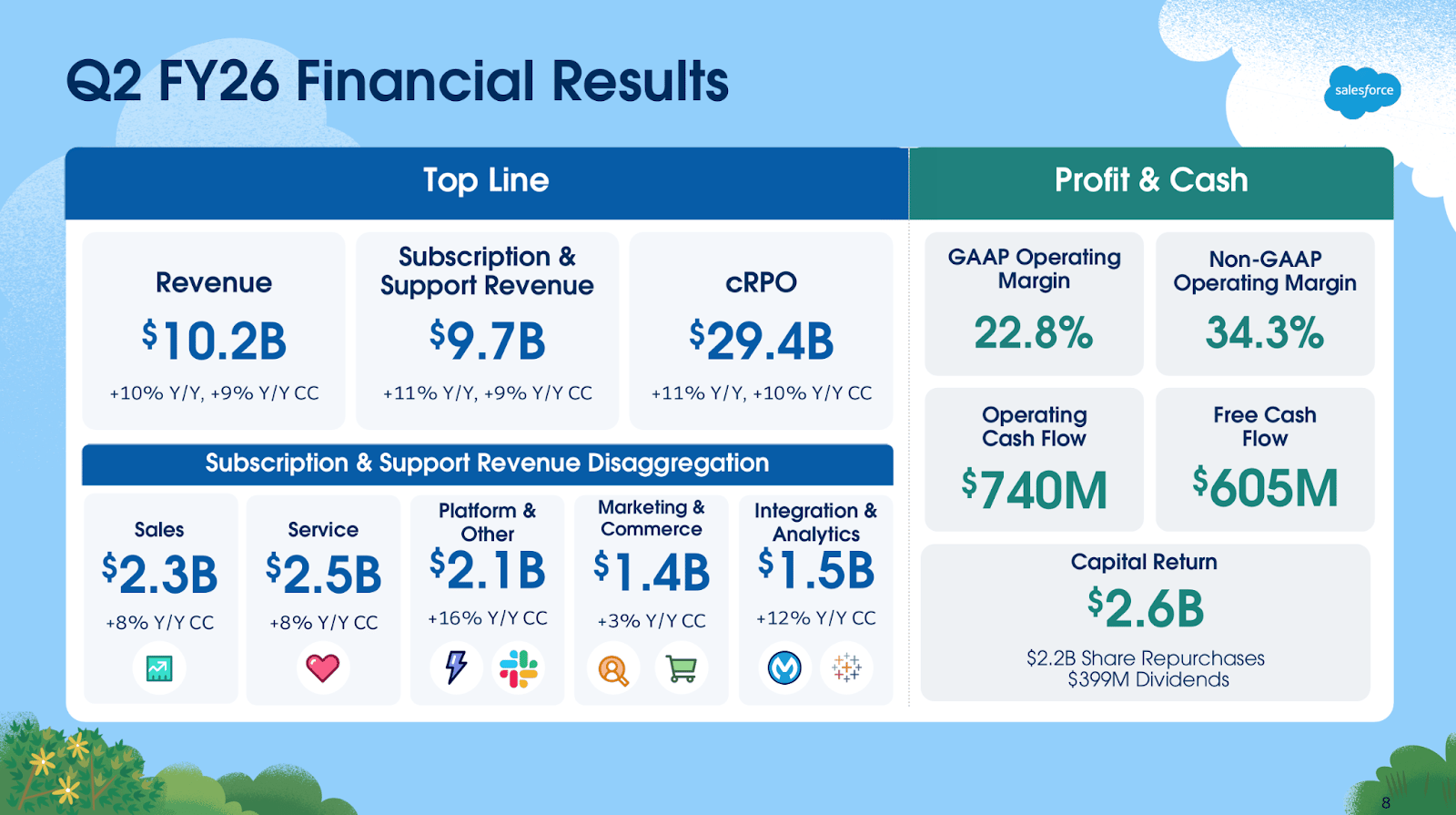 Last quarter, Salesforce posted $9.4 billion in revenue (+8% YoY) and $2.44 in adjusted EPS (+17% YoY), both above expectations. Subscription & Support revenue grew +10% YoY, while operating margin held at an impressive ~32%, supported by continued cost controls. Cloud segments — including Data Cloud and Service Cloud — saw healthy demand, though management noted elongated deal cycles in certain enterprise verticals.
