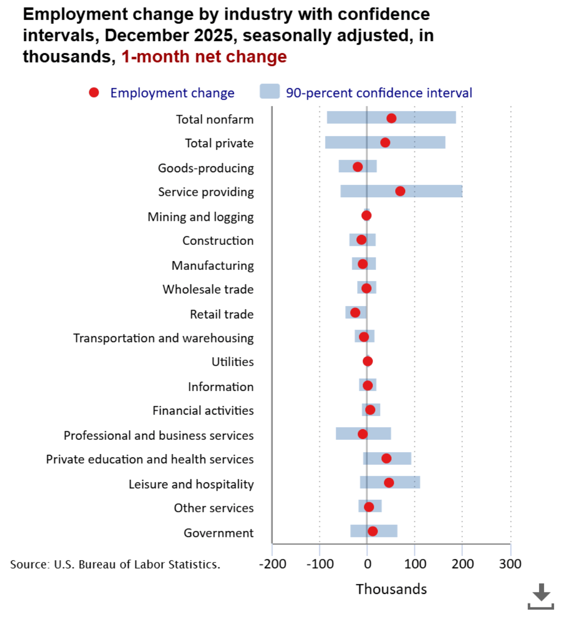 For full-year 2025, payrolls rose by 584K, averaging just 49K per month, a sharp slowdown from the 2.0 million jobs added in 2024. The data points to a labor market that is losing steam without tipping into outright contraction.