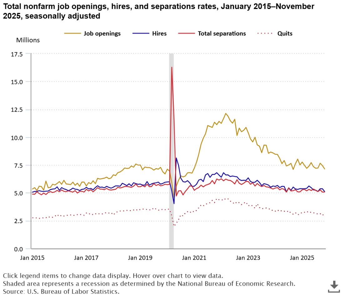 U.S. job openings fell sharply to 7.15 million in November, down 303,000 from October and well below expectations for 7.60 million. The reading marks the lowest level since September 2024.