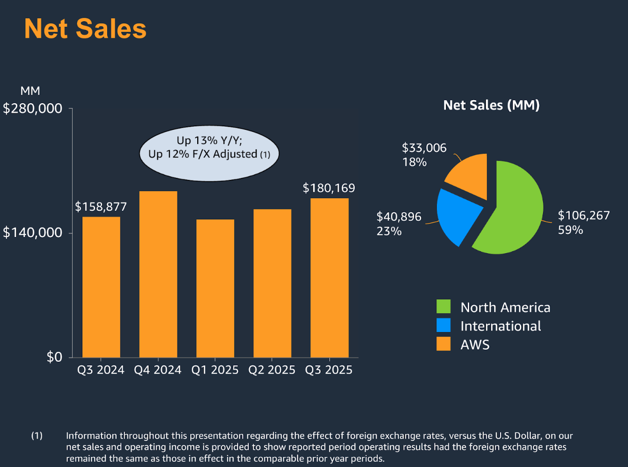 Last quarter, Amazon delivered $157.4 billion in revenue (+11% YoY) and $1.00 in EPS, beating expectations as AWS growth reaccelerated to +19% YoY and operating income expanded across both North America and International segments. Management highlighted rising demand for generative AI workloads, stronger advertising performance, and continued efficiency gains in fulfillment — though capex remained elevated as Amazon scaled data centers and logistics capacity.
