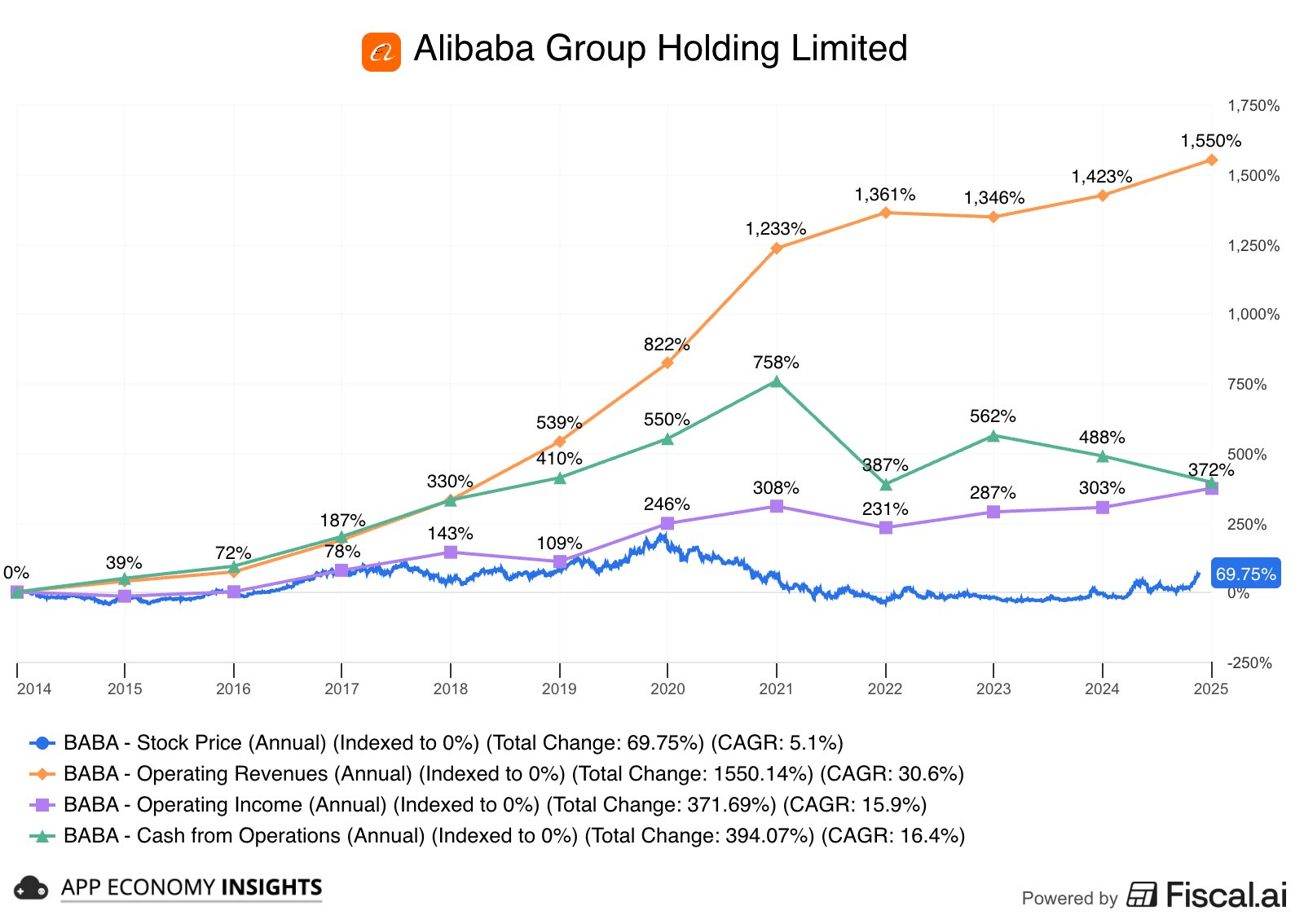 Last quarter, Alibaba posted RMB 241.2 billion in revenue (+8% YoY) and RMB 15.1 in adjusted EPS (+12% YoY), with strength in Taobao & Tmall Group and improving profitability in its Cloud Intelligence segment. Cloud revenue grew +12%, supported by enterprise AI adoption, while International Commerce (+19%) continued to scale on the back of AliExpress Choice and Lazada.