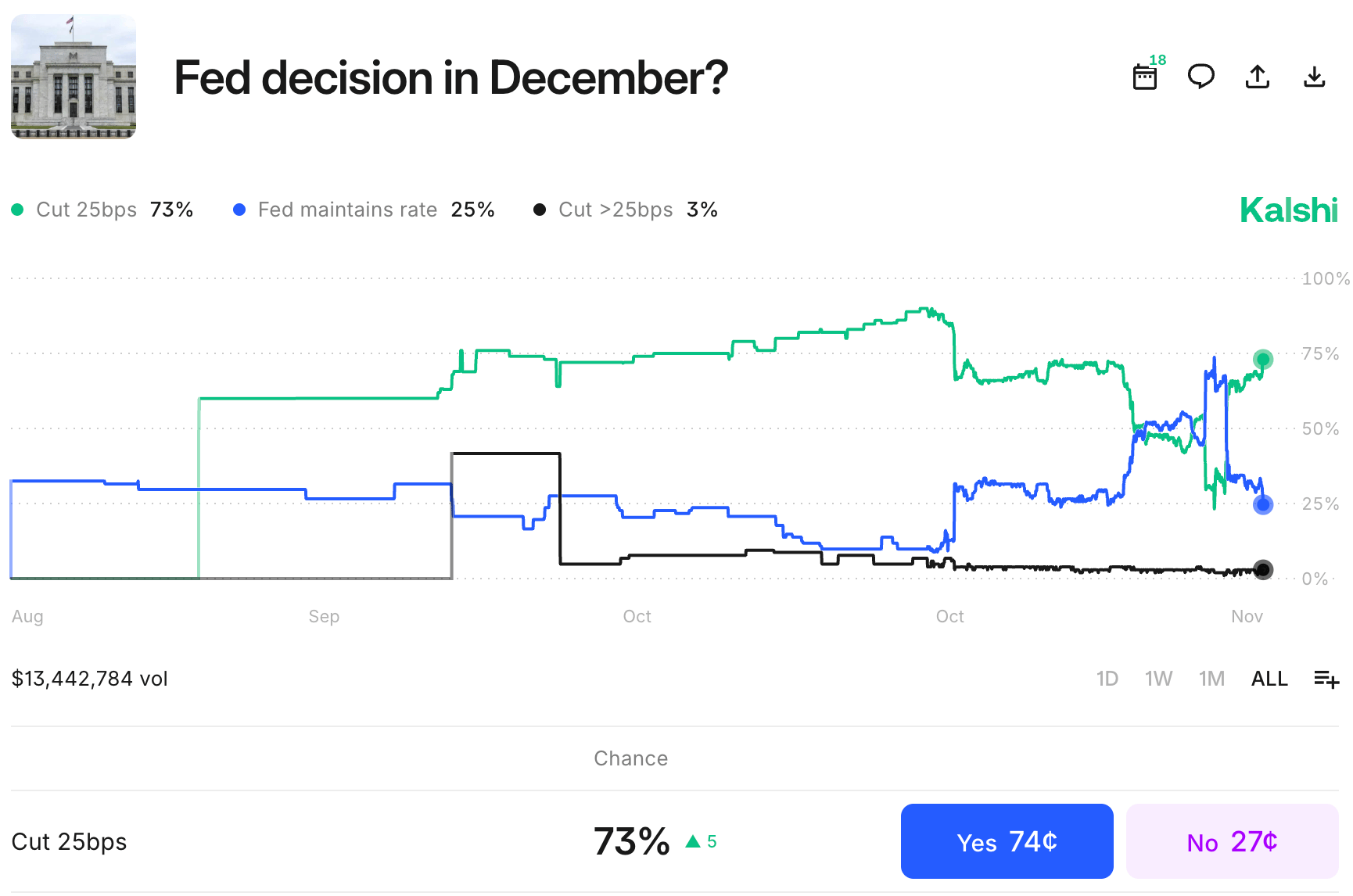 Rate-cut expectations flipped sharply this week, with markets now assigning meaningfully higher odds to a 25bps cut at the December FOMC meeting — a major reversal from just days ago when a hold was overwhelmingly expected.