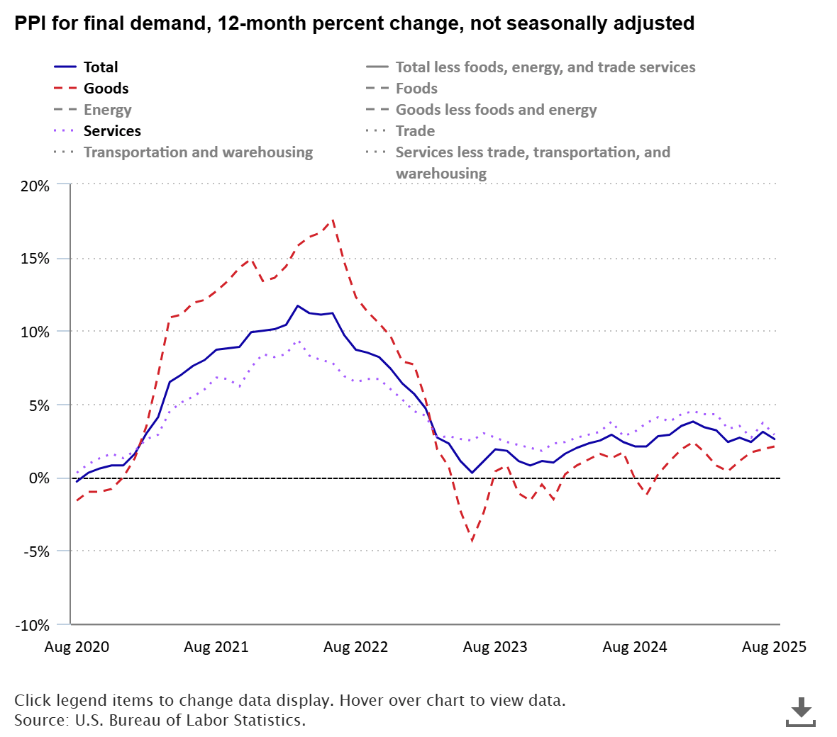 Year-over-year, headline PPI slowed to +2.6% (down from 3.1% prior), while core PPI also declined 0.1% MoM, pulling the annual core rate down to 2.8%, underscoring easing upstream inflation pressures.