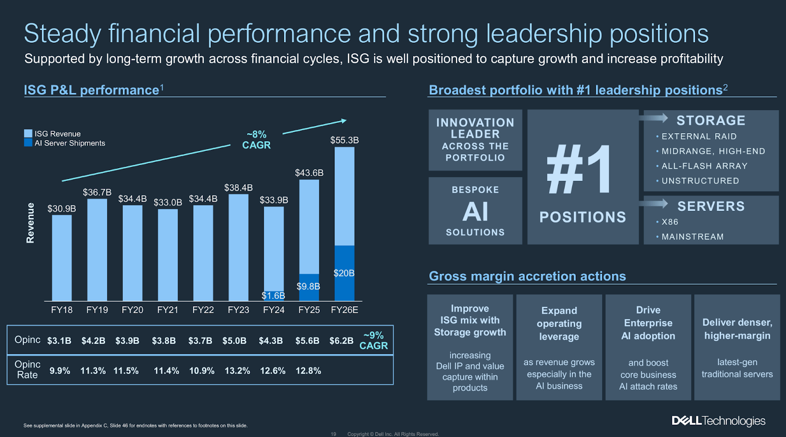 Last quarter, Dell delivered $23.5 billion in revenue (+7% YoY) and $1.89 in adjusted EPS (+12% YoY), beating expectations as AI-server orders surged more than 100% YoY and backlog expanded sharply. Infrastructure Solutions Group revenue climbed +15%, while Client Solutions (PCs) showed early signs of recovery but remained choppy due to weak commercial demand.