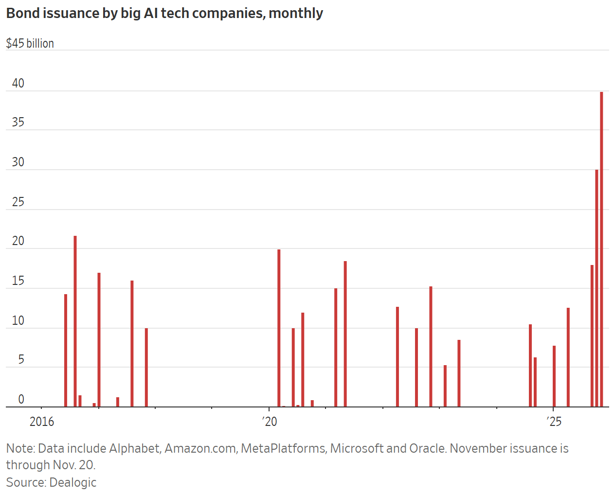 Wall Street is absorbing a flood of new debt from AI-heavy tech companies, creating unexpected strain across credit markets. Since early September, Amazon, Alphabet, Meta, and Oracle have issued nearly $90B in investment-grade bonds – more than the previous 40 months combined. AI data-center developers like TeraWulf and Cipher Mining have added another $7B in high-yield issuance.