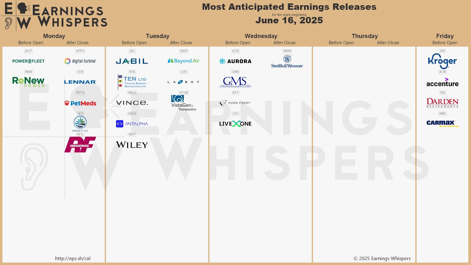 Very small week of earnings — Accenture, Darden Restaurants, Jabil and Kroger headline.