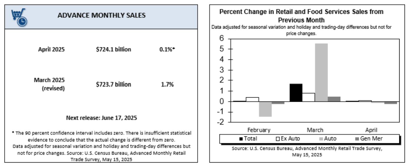 U.S. retail sales rose just +0.1% in April, a sharp slowdown from March’s upwardly revised +1.7% gain, as consumers pulled back after a wave of tariff announcements early in the month. Categories like dining (+1.2%) and home improvement (+0.8%) led gains, while discretionary segments such as sporting goods (-2.5%) and apparel (-0.4%) declined. Core retail sale — the GDP component — fell -0.2%, suggesting consumer strength may be softening under inflation and policy uncertainty.