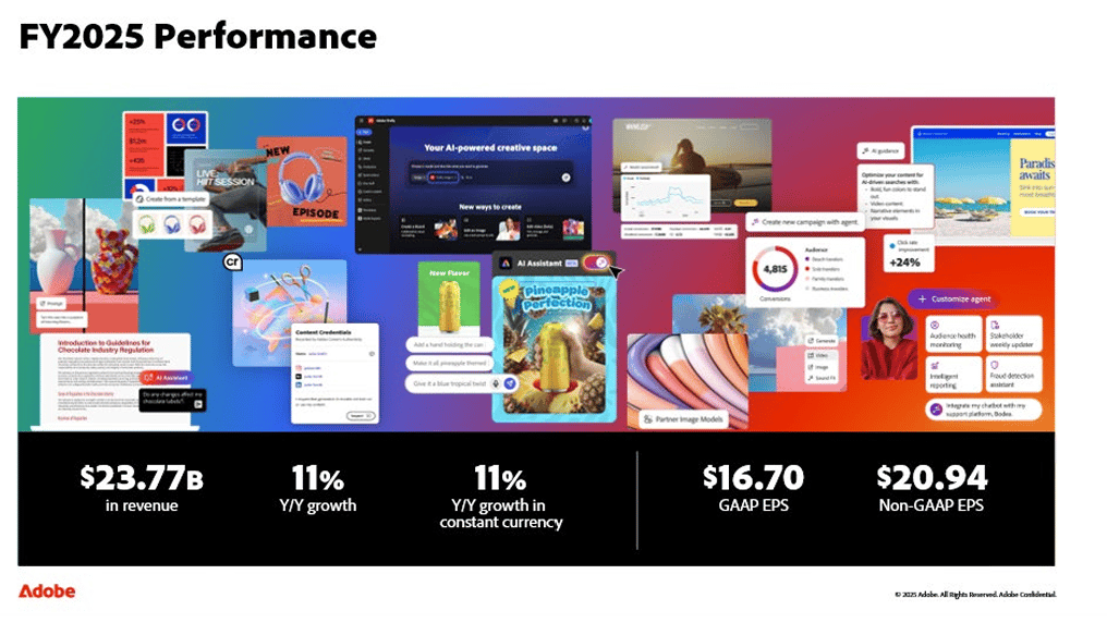 Last quarter, Adobe delivered record revenue of $6.19 billion (+10% YoY) and $5.50 in adjusted EPS, with strong demand across Creative Cloud, Acrobat, and AI-powered tools like Firefly helping drive engagement and subscription growth.